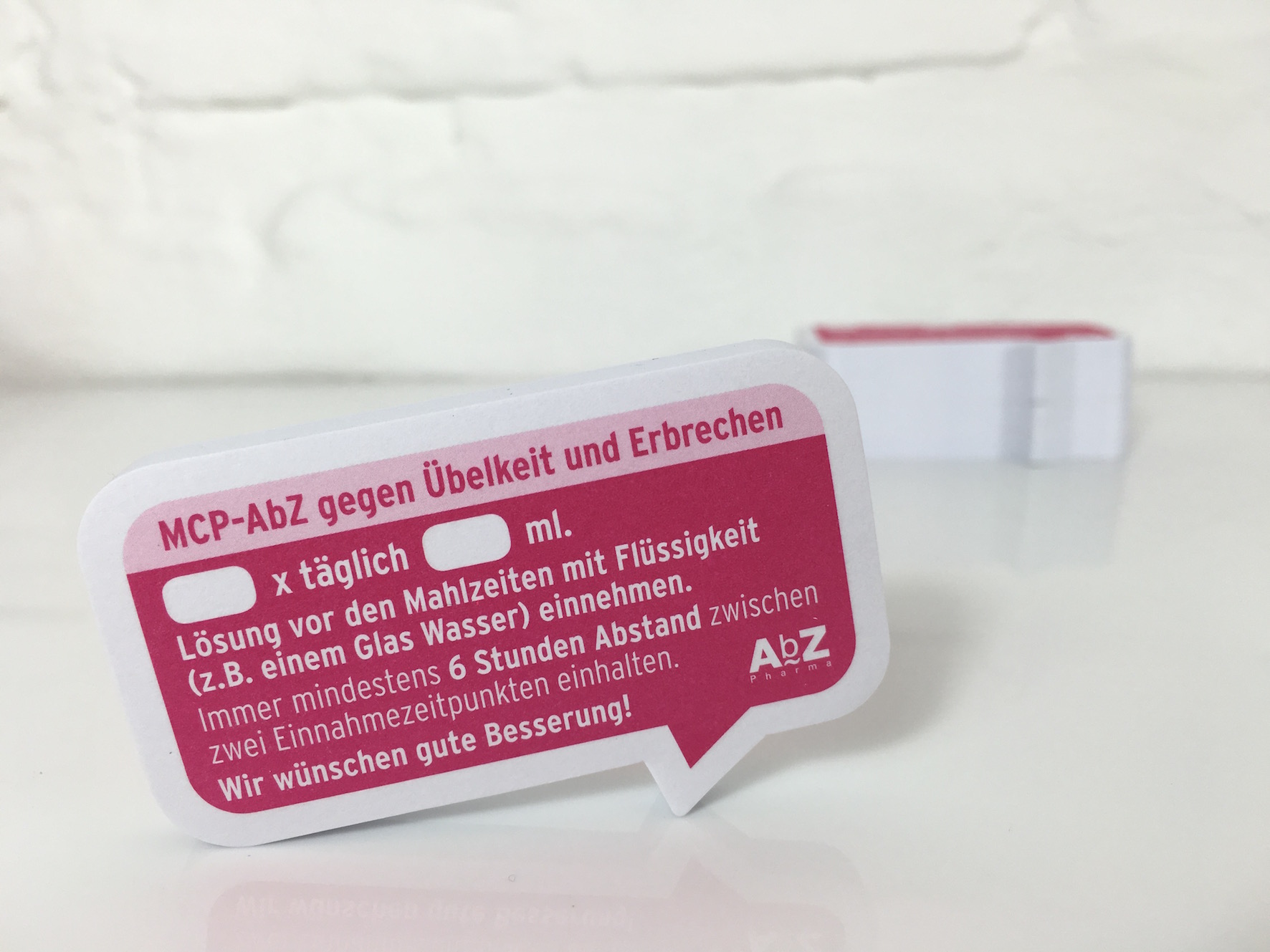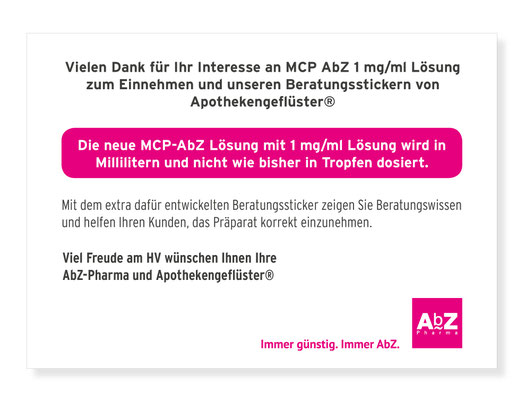 Eine Produktmanagerin der AbZ-Pharma GmbH stand bei dem Relaunch des Präparats MCP AbZ 1mg/ml Lösung vor einer üblichen Herausforderung des Pharmamarketings: Die Konzentration der MCP-Lösung hatte sich verändert und die übliche Dosierungsempfehlung galt nicht mehr. Bisher wurde das Präparat in Tropfen dosiert, fortan in Millilitern - hier lauerte die Gefahr einer Überdosierung. Um Dosierungsfehler zu verhindern, wurde die neue Dosierungsempfehlung mit einer Apothekengeflüster® Blitzkampagne schnell und intensiv ins Gedächtnis der verordnenden Ärzte und des pharmazeutischen Personals eingeimpft. Jeweils drei Apothekengeflüster® Beratungsstickerblöcke standen zusammen mit einer Beratungskarte für den freiwilligen Abruf durch das Fachpersonal bereit.